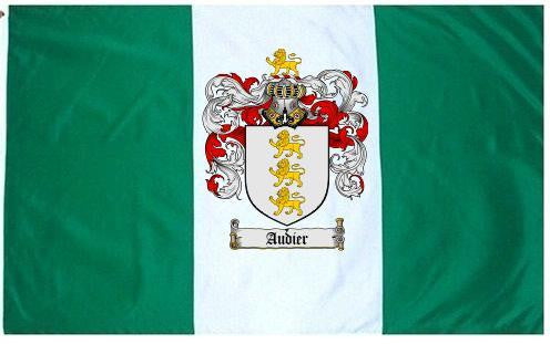 Audier Family Crest Flag / Coat of Arms Flag. You will receive a high quality 3' x 5' Polyester flag with two brass grommets. Proudly display your family heritage with this flag, or hang as a banner on a wall. Our flags make great gifts for birthdays, weddings, anniversaries, fathers day, mothers day, groomsmen gifts, and any other occasion
