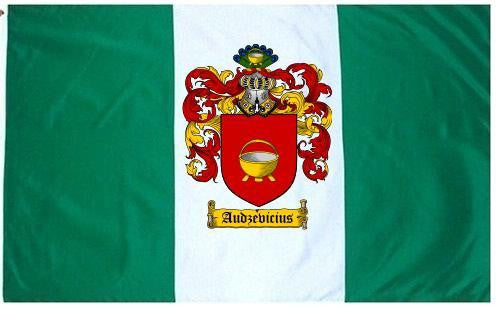 Audzevicius Family Crest Flag / Coat of Arms Flag. You will receive a high quality 3' x 5' Polyester flag with two brass grommets. Proudly display your family heritage with this flag, or hang as a banner on a wall. Our flags make great gifts for birthdays, weddings, anniversaries, fathers day, mothers day, groomsmen gifts, and any other occasion