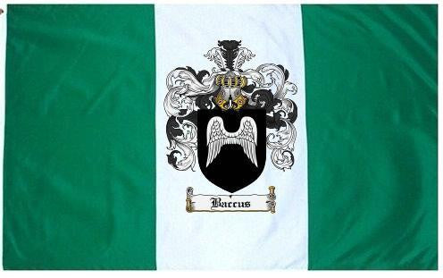 Baccus Family Crest Flag / Coat of Arms Flag. You will receive a high quality 3' x 5' Polyester flag with two brass grommets. Proudly display your family heritage with this flag, or hang as a banner on a wall. Our flags make great gifts for birthdays, weddings, anniversaries, fathers day, mothers day, groomsmen gifts, and any other occasion