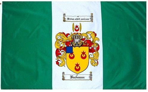 Bademan Family Crest Flag / Coat of Arms Flag. You will receive a high quality 3' x 5' Polyester flag with two brass grommets. Proudly display your family heritage with this flag, or hang as a banner on a wall. Our flags make great gifts for birthdays, weddings, anniversaries, fathers day, mothers day, groomsmen gifts, and any other occasion