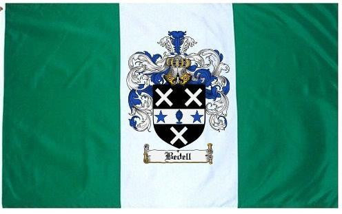 Bedell Family Crest Flag / Coat of Arms Flag. You will receive a high quality 3' x 5' Polyester flag with two brass grommets. Proudly display your family heritage with this flag, or hang as a banner on a wall. Our flags make great gifts for birthdays, weddings, anniversaries, fathers day, mothers day, groomsmen gifts, and any other occasion