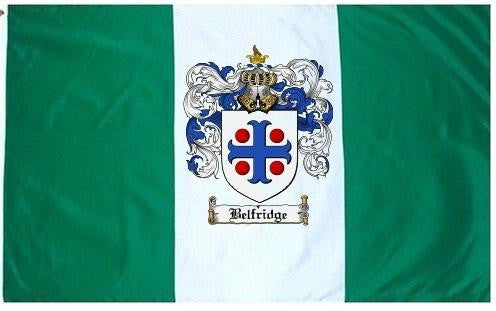 Belfridge Family Crest Flag / Coat of Arms Flag. You will receive a high quality 3' x 5' Polyester flag with two brass grommets. Proudly display your family heritage with this flag, or hang as a banner on a wall. Our flags make great gifts for birthdays, weddings, anniversaries, fathers day, mothers day, groomsmen gifts, and any other occasion