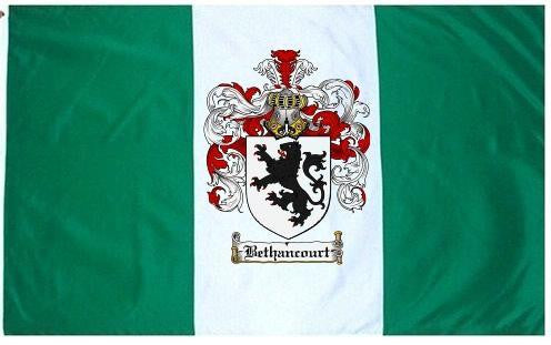 Bethancourt Family Crest Flag / Coat of Arms Flag. You will receive a high quality 3' x 5' Polyester flag with two brass grommets. Proudly display your family heritage with this flag, or hang as a banner on a wall. Our flags make great gifts for birthdays, weddings, anniversaries, fathers day, mothers day, groomsmen gifts, and any other occasion