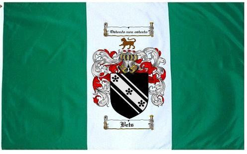 Bets Family Crest Flag / Coat of Arms Flag. You will receive a high quality 3' x 5' Polyester flag with two brass grommets. Proudly display your family heritage with this flag, or hang as a banner on a wall. Our flags make great gifts for birthdays, weddings, anniversaries, fathers day, mothers day, groomsmen gifts, and any other occasion