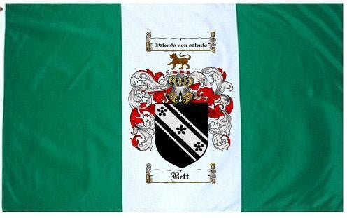 Bett Family Crest Flag / Coat of Arms Flag. You will receive a high quality 3' x 5' Polyester flag with two brass grommets. Proudly display your family heritage with this flag, or hang as a banner on a wall. Our flags make great gifts for birthdays, weddings, anniversaries, fathers day, mothers day, groomsmen gifts, and any other occasion