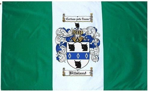 Billsland Family Crest Flag / Coat of Arms Flag. You will receive a high quality 3' x 5' Polyester flag with two brass grommets. Proudly display your family heritage with this flag, or hang as a banner on a wall. Our flags make great gifts for birthdays, weddings, anniversaries, fathers day, mothers day, groomsmen gifts, and any other occasion
