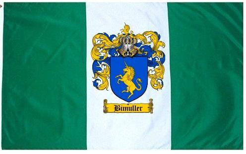 Bimuller Family Crest Flag / Coat of Arms Flag. You will receive a high quality 3' x 5' Polyester flag with two brass grommets. Proudly display your family heritage with this flag, or hang as a banner on a wall. Our flags make great gifts for birthdays, weddings, anniversaries, fathers day, mothers day, groomsmen gifts, and any other occasion
