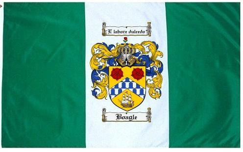 Boagle Family Crest Flag / Coat of Arms Flag. You will receive a high quality 3' x 5' Polyester flag with two brass grommets. Proudly display your family heritage with this flag, or hang as a banner on a wall. Our flags make great gifts for birthdays, weddings, anniversaries, fathers day, mothers day, groomsmen gifts, and any other occasion