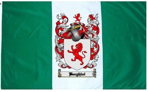 Borghini Family Crest Flag / Coat of Arms Flag. You will receive a high quality 3' x 5' Polyester flag with two brass grommets. Proudly display your family heritage with this flag, or hang as a banner on a wall. Our flags make great gifts for birthdays, weddings, anniversaries, fathers day, mothers day, groomsmen gifts, and any other occasion