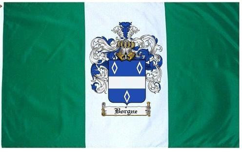 Borgne Family Crest Flag / Coat of Arms Flag. You will receive a high quality 3' x 5' Polyester flag with two brass grommets. Proudly display your family heritage with this flag, or hang as a banner on a wall. Our flags make great gifts for birthdays, weddings, anniversaries, fathers day, mothers day, groomsmen gifts, and any other occasion