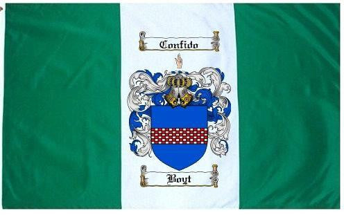 Boyt Family Crest Flag / Coat of Arms Flag. You will receive a high quality 3' x 5' Polyester flag with two brass grommets. Proudly display your family heritage with this flag, or hang as a banner on a wall. Our flags make great gifts for birthdays, weddings, anniversaries, fathers day, mothers day, groomsmen gifts, and any other occasion