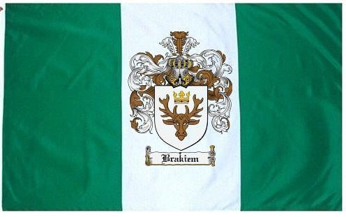 Brakiem Family Crest Flag / Coat of Arms Flag. You will receive a high quality 3' x 5' Polyester flag with two brass grommets. Proudly display your family heritage with this flag, or hang as a banner on a wall. Our flags make great gifts for birthdays, weddings, anniversaries, fathers day, mothers day, groomsmen gifts, and any other occasion