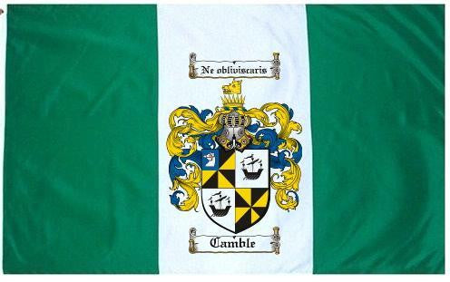 Camble Family Crest Flag / Coat of Arms Flag. You will receive a high quality 3' x 5' Polyester flag with two brass grommets. Proudly display your family heritage with this flag, or hang as a banner on a wall. Our flags make great gifts for birthdays, weddings, anniversaries, fathers day, mothers day, groomsmen gifts, and any other occasion