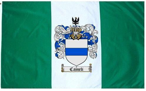 Cameli Family Crest Flag / Coat of Arms Flag. You will receive a high quality 3' x 5' Polyester flag with two brass grommets. Proudly display your family heritage with this flag, or hang as a banner on a wall. Our flags make great gifts for birthdays, weddings, anniversaries, fathers day, mothers day, groomsmen gifts, and any other occasion