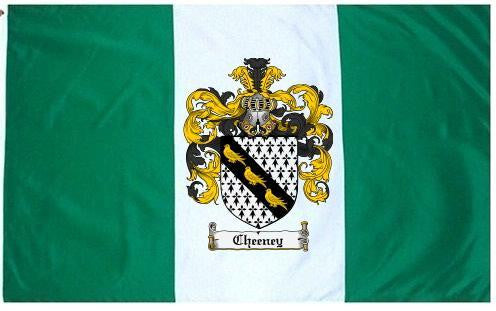 Cheeney Family Crest Flag / Coat of Arms Flag. You will receive a high quality 3' x 5' Polyester flag with two brass grommets. Proudly display your family heritage with this flag, or hang as a banner on a wall. Our flags make great gifts for birthdays, weddings, anniversaries, fathers day, mothers day, groomsmen gifts, and any other occasion