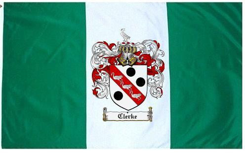 Clerke Family Crest Flag / Coat of Arms Flag. You will receive a high quality 3' x 5' Polyester flag with two brass grommets. Proudly display your family heritage with this flag, or hang as a banner on a wall. Our flags make great gifts for birthdays, weddings, anniversaries, fathers day, mothers day, groomsmen gifts, and any other occasion