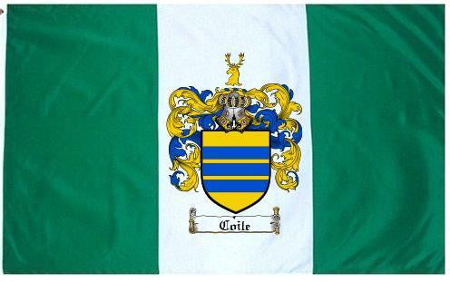 Coile Family Crest Flag / Coat of Arms Flag. You will receive a high quality 3' x 5' Polyester flag with two brass grommets. Proudly display your family heritage with this flag, or hang as a banner on a wall. Our flags make great gifts for birthdays, weddings, anniversaries, fathers day, mothers day, groomsmen gifts, and any other occasion