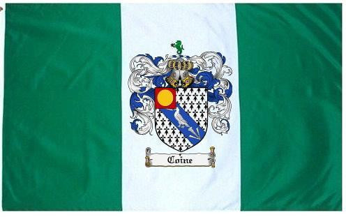 Coine Family Crest Flag / Coat of Arms Flag. You will receive a high quality 3' x 5' Polyester flag with two brass grommets. Proudly display your family heritage with this flag, or hang as a banner on a wall. Our flags make great gifts for birthdays, weddings, anniversaries, fathers day, mothers day, groomsmen gifts, and any other occasion