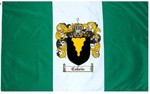 Cokein Family Crest Flag / Coat of Arms Flag. You will receive a high quality 3' x 5' Polyester flag with two brass grommets. Proudly display your family heritage with this flag, or hang as a banner on a wall. Our flags make great gifts for birthdays, weddings, anniversaries, fathers day, mothers day, groomsmen gifts, and any other occasion