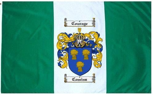 Comins Family Crest Flag / Coat of Arms Flag. You will receive a high quality 3' x 5' Polyester flag with two brass grommets. Proudly display your family heritage with this flag, or hang as a banner on a wall. Our flags make great gifts for birthdays, weddings, anniversaries, fathers day, mothers day, groomsmen gifts, and any other occasion