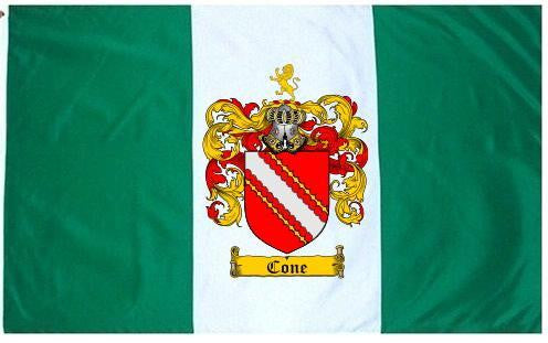 Cone Family Crest Flag / Coat of Arms Flag. You will receive a high quality 3' x 5' Polyester flag with two brass grommets. Proudly display your family heritage with this flag, or hang as a banner on a wall. Our flags make great gifts for birthdays, weddings, anniversaries, fathers day, mothers day, groomsmen gifts, and any other occasion
