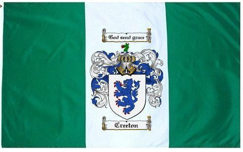 Creeton Family Crest Flag / Coat of Arms Flag. You will receive a high quality 3' x 5' Polyester flag with two brass grommets. Proudly display your family heritage with this flag, or hang as a banner on a wall. Our flags make great gifts for birthdays, weddings, anniversaries, fathers day, mothers day, groomsmen gifts, and any other occasion