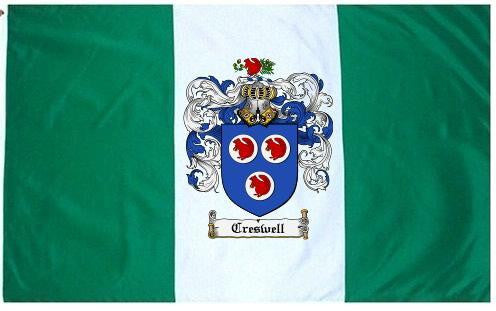Creswell Family Crest Flag / Coat of Arms Flag. You will receive a high quality 3' x 5' Polyester flag with two brass grommets. Proudly display your family heritage with this flag, or hang as a banner on a wall. Our flags make great gifts for birthdays, weddings, anniversaries, fathers day, mothers day, groomsmen gifts, and any other occasion