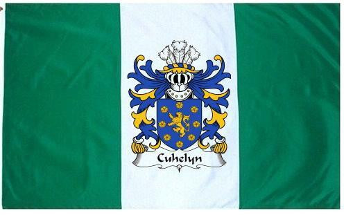 Cuhelyn Family Crest Flag / Coat of Arms Flag. You will receive a high quality 3' x 5' Polyester flag with two brass grommets. Proudly display your family heritage with this flag, or hang as a banner on a wall. Our flags make great gifts for birthdays, weddings, anniversaries, fathers day, mothers day, groomsmen gifts, and any other occasion