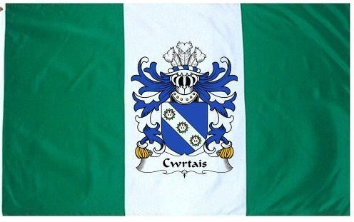 Cwrtais Family Crest Flag / Coat of Arms Flag. You will receive a high quality 3' x 5' Polyester flag with two brass grommets. Proudly display your family heritage with this flag, or hang as a banner on a wall. Our flags make great gifts for birthdays, weddings, anniversaries, fathers day, mothers day, groomsmen gifts, and any other occasion