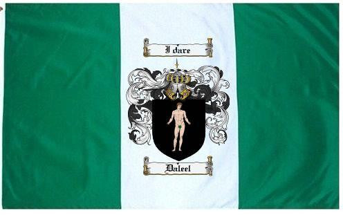 Daleel Family Crest Flag / Coat of Arms Flag. You will receive a high quality 3' x 5' Polyester flag with two brass grommets. Proudly display your family heritage with this flag, or hang as a banner on a wall. Our flags make great gifts for birthdays, weddings, anniversaries, fathers day, mothers day, groomsmen gifts, and any other occasion
