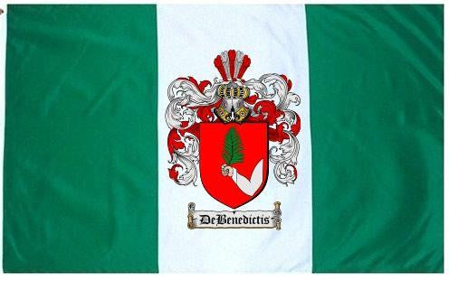Debenedictis Family Crest Flag / Coat of Arms Flag. You will receive a high quality 3' x 5' Polyester flag with two brass grommets. Proudly display your family heritage with this flag, or hang as a banner on a wall. Our flags make great gifts for birthdays, weddings, anniversaries, fathers day, mothers day, groomsmen gifts, and any other occasion