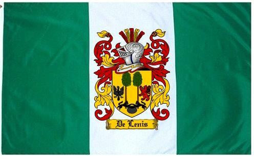 Delenis Family Crest Flag / Coat of Arms Flag. You will receive a high quality 3' x 5' Polyester flag with two brass grommets. Proudly display your family heritage with this flag, or hang as a banner on a wall. Our flags make great gifts for birthdays, weddings, anniversaries, fathers day, mothers day, groomsmen gifts, and any other occasion