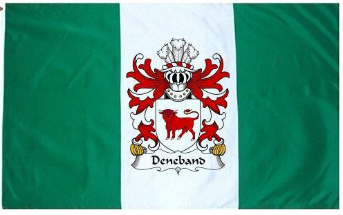 Deneband Family Crest Flag / Coat of Arms Flag. You will receive a high quality 3' x 5' Polyester flag with two brass grommets. Proudly display your family heritage with this flag, or hang as a banner on a wall. Our flags make great gifts for birthdays, weddings, anniversaries, fathers day, mothers day, groomsmen gifts, and any other occasion