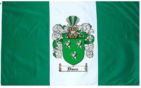 Dison Family Crest Flag / Coat of Arms Flag. You will receive a high quality 3' x 5' Polyester flag with two brass grommets. Proudly display your family heritage with this flag, or hang as a banner on a wall. Our flags make great gifts for birthdays, weddings, anniversaries, fathers day, mothers day, groomsmen gifts, and any other occasion