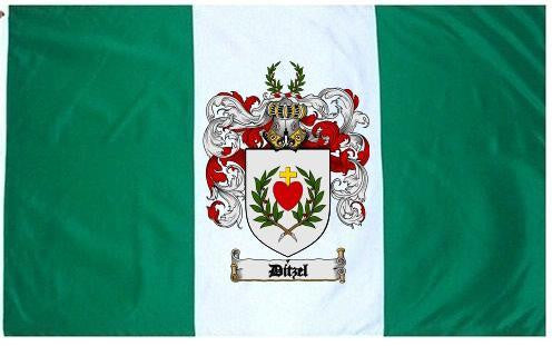 Ditzel Family Crest Flag / Coat of Arms Flag. You will receive a high quality 3' x 5' Polyester flag with two brass grommets. Proudly display your family heritage with this flag, or hang as a banner on a wall. Our flags make great gifts for birthdays, weddings, anniversaries, fathers day, mothers day, groomsmen gifts, and any other occasion