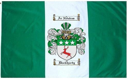 Dockharty Family Crest Flag / Coat of Arms Flag. You will receive a high quality 3' x 5' Polyester flag with two brass grommets. Proudly display your family heritage with this flag, or hang as a banner on a wall. Our flags make great gifts for birthdays, weddings, anniversaries, fathers day, mothers day, groomsmen gifts, and any other occasion