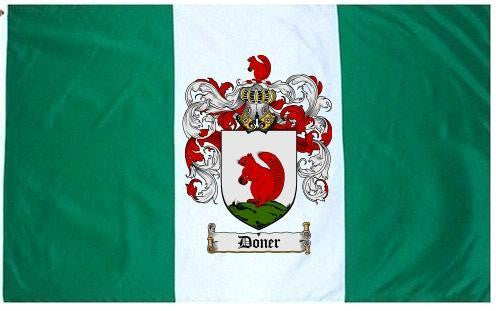 Doner Family Crest Flag / Coat of Arms Flag. You will receive a high quality 3' x 5' Polyester flag with two brass grommets. Proudly display your family heritage with this flag, or hang as a banner on a wall. Our flags make great gifts for birthdays, weddings, anniversaries, fathers day, mothers day, groomsmen gifts, and any other occasion