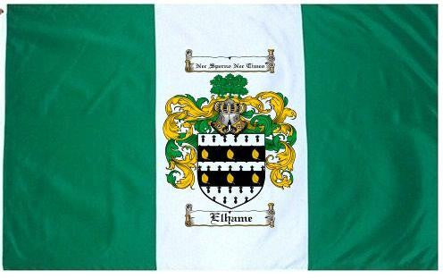 Elhame Family Crest Flag / Coat of Arms Flag. You will receive a high quality 3' x 5' Polyester flag with two brass grommets. Proudly display your family heritage with this flag, or hang as a banner on a wall. Our flags make great gifts for birthdays, weddings, anniversaries, fathers day, mothers day, groomsmen gifts, and any other occasion