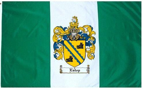 Estop Family Crest Flag / Coat of Arms Flag. You will receive a high quality 3' x 5' Polyester flag with two brass grommets. Proudly display your family heritage with this flag, or hang as a banner on a wall. Our flags make great gifts for birthdays, weddings, anniversaries, fathers day, mothers day, groomsmen gifts, and any other occasion