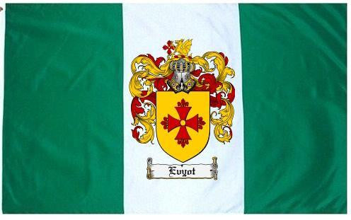 Evyot Family Crest Flag / Coat of Arms Flag. You will receive a high quality 3' x 5' Polyester flag with two brass grommets. Proudly display your family heritage with this flag, or hang as a banner on a wall. Our flags make great gifts for birthdays, weddings, anniversaries, fathers day, mothers day, groomsmen gifts, and any other occasion