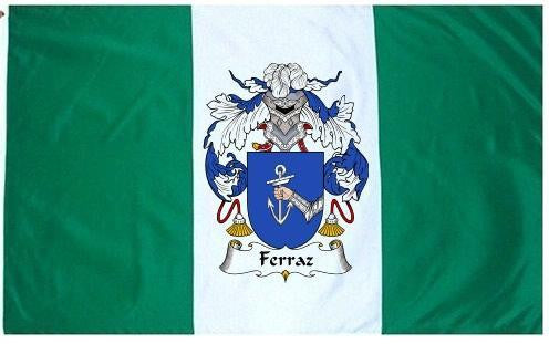 Ferraz Family Crest Flag / Coat of Arms Flag. You will receive a high quality 3' x 5' Polyester flag with two brass grommets. Proudly display your family heritage with this flag, or hang as a banner on a wall. Our flags make great gifts for birthdays, weddings, anniversaries, fathers day, mothers day, groomsmen gifts, and any other occasion