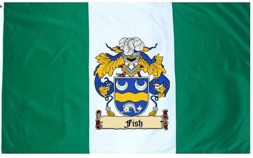 Fish Family Crest Flag / Coat of Arms Flag. You will receive a high quality 3' x 5' Polyester flag with two brass grommets. Proudly display your family heritage with this flag, or hang as a banner on a wall. Our flags make great gifts for birthdays, weddings, anniversaries, fathers day, mothers day, groomsmen gifts, and any other occasion