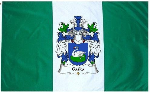 Gaska Family Crest Flag / Coat of Arms Flag. You will receive a high quality 3' x 5' Polyester flag with two brass grommets. Proudly display your family heritage with this flag, or hang as a banner on a wall. Our flags make great gifts for birthdays, weddings, anniversaries, fathers day, mothers day, groomsmen gifts, and any other occasion