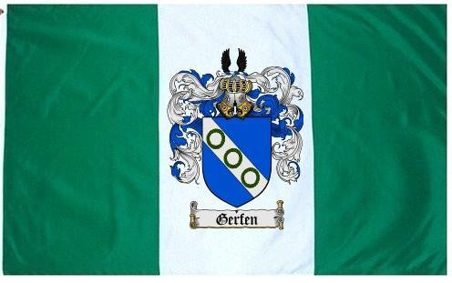 Gerfen Family Crest Flag / Coat of Arms Flag. You will receive a high quality 3' x 5' Polyester flag with two brass grommets. Proudly display your family heritage with this flag, or hang as a banner on a wall. Our flags make great gifts for birthdays, weddings, anniversaries, fathers day, mothers day, groomsmen gifts, and any other occasion