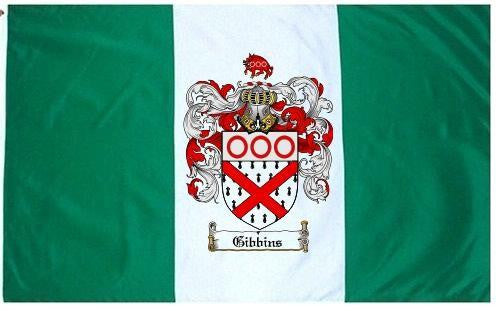 Gibbins Family Crest Flag / Coat of Arms Flag. You will receive a high quality 3' x 5' Polyester flag with two brass grommets. Proudly display your family heritage with this flag, or hang as a banner on a wall. Our flags make great gifts for birthdays, weddings, anniversaries, fathers day, mothers day, groomsmen gifts, and any other occasion