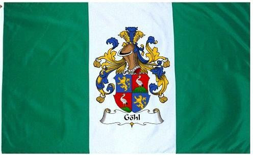 Gohl Family Crest Flag / Coat of Arms Flag. You will receive a high quality 3' x 5' Polyester flag with two brass grommets. Proudly display your family heritage with this flag, or hang as a banner on a wall. Our flags make great gifts for birthdays, weddings, anniversaries, fathers day, mothers day, groomsmen gifts, and any other occasion