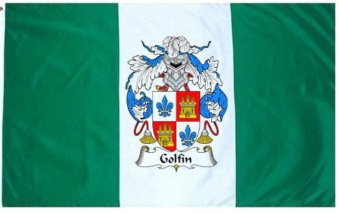 Golfin Family Crest Flag / Coat of Arms Flag. You will receive a high quality 3' x 5' Polyester flag with two brass grommets. Proudly display your family heritage with this flag, or hang as a banner on a wall. Our flags make great gifts for birthdays, weddings, anniversaries, fathers day, mothers day, groomsmen gifts, and any other occasion