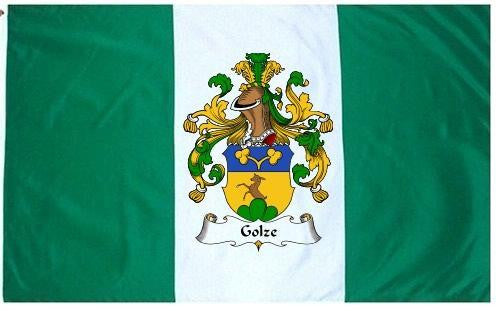 Golze Family Crest Flag / Coat of Arms Flag. You will receive a high quality 3' x 5' Polyester flag with two brass grommets. Proudly display your family heritage with this flag, or hang as a banner on a wall. Our flags make great gifts for birthdays, weddings, anniversaries, fathers day, mothers day, groomsmen gifts, and any other occasion