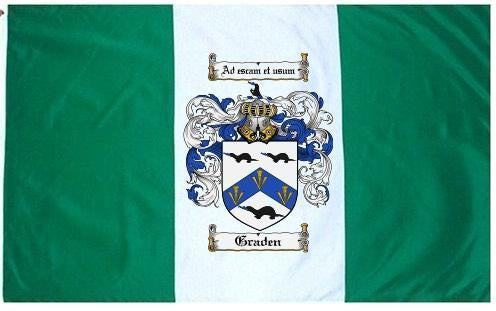 Graden Family Crest Flag / Coat of Arms Flag. You will receive a high quality 3' x 5' Polyester flag with two brass grommets. Proudly display your family heritage with this flag, or hang as a banner on a wall. Our flags make great gifts for birthdays, weddings, anniversaries, fathers day, mothers day, groomsmen gifts, and any other occasion