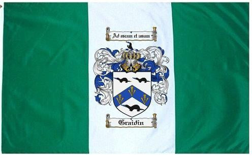 Graidin Family Crest Flag / Coat of Arms Flag. You will receive a high quality 3' x 5' Polyester flag with two brass grommets. Proudly display your family heritage with this flag, or hang as a banner on a wall. Our flags make great gifts for birthdays, weddings, anniversaries, fathers day, mothers day, groomsmen gifts, and any other occasion